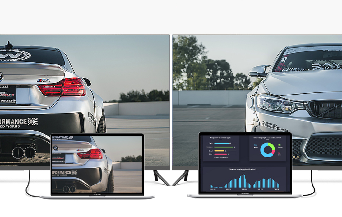 Kabel obsługuje 2 tryby wyświetlania. Używając go, możesz na przykład powielić obraz z laptopa na telewizorze. To doskonałe rozwiązanie, jeśli planujesz obejrzeć film lub serial. Dostępny jest również tryb rozszerzony. Korzystając z niego, możesz wyświetlić prezentację dla publiczności na jednym ekranie, a na drugim otworzyć swoje notatki.
